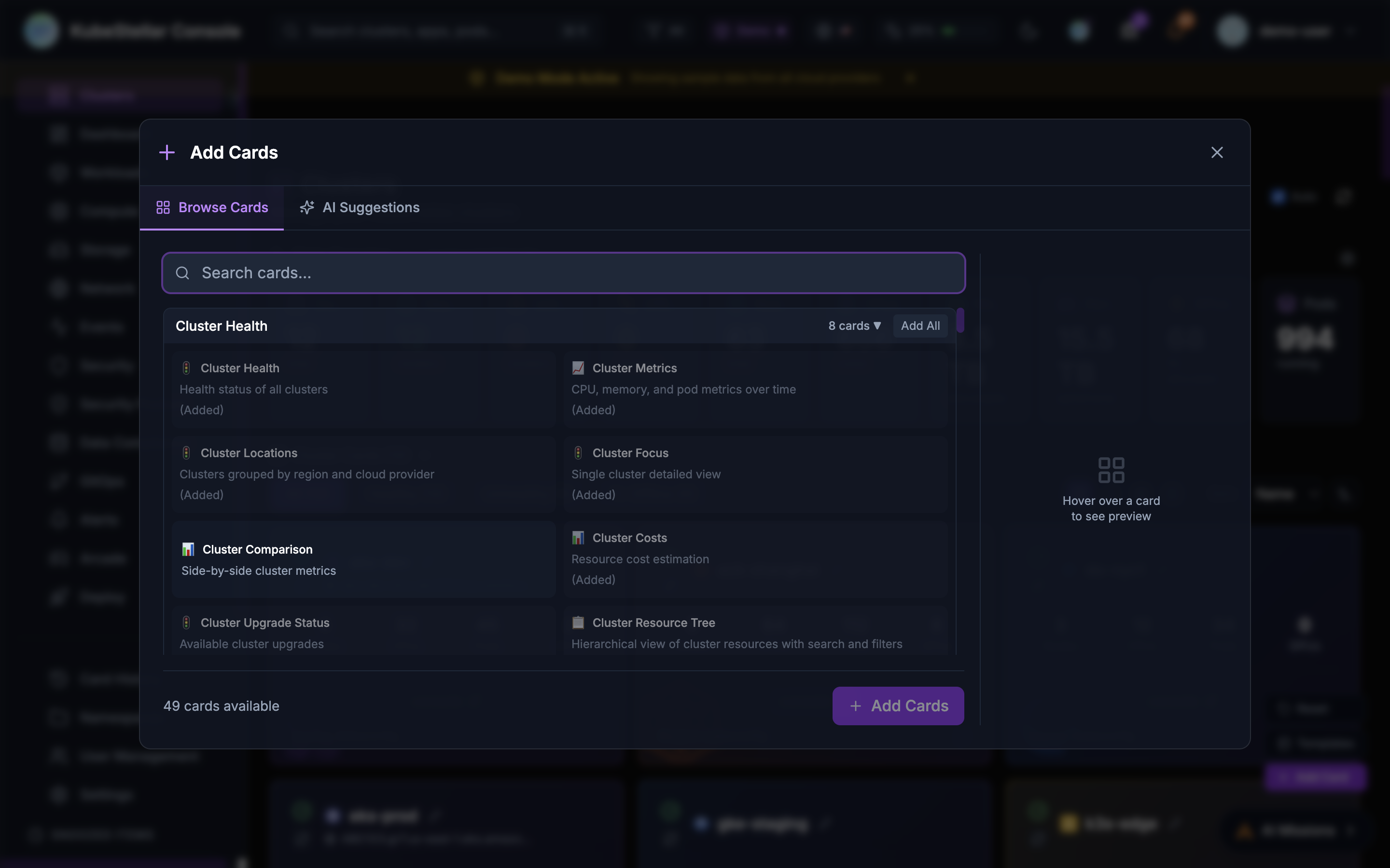 The KubeStellar Console includes over 100 dashboard cards organized into categories. Cards can display live data from your clusters or demo data for evaluation.
