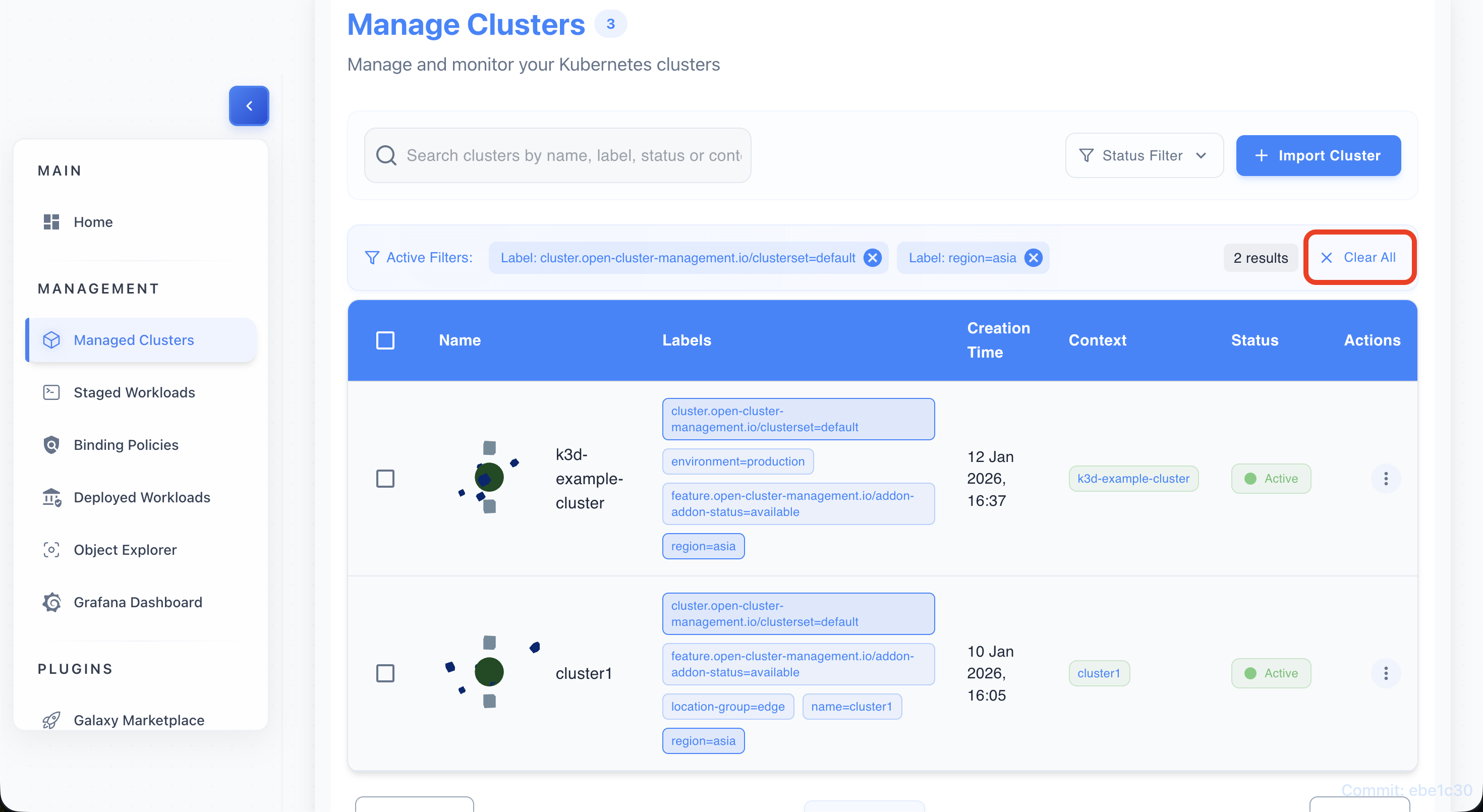 - The table updates to show only clusters matching the selected label.