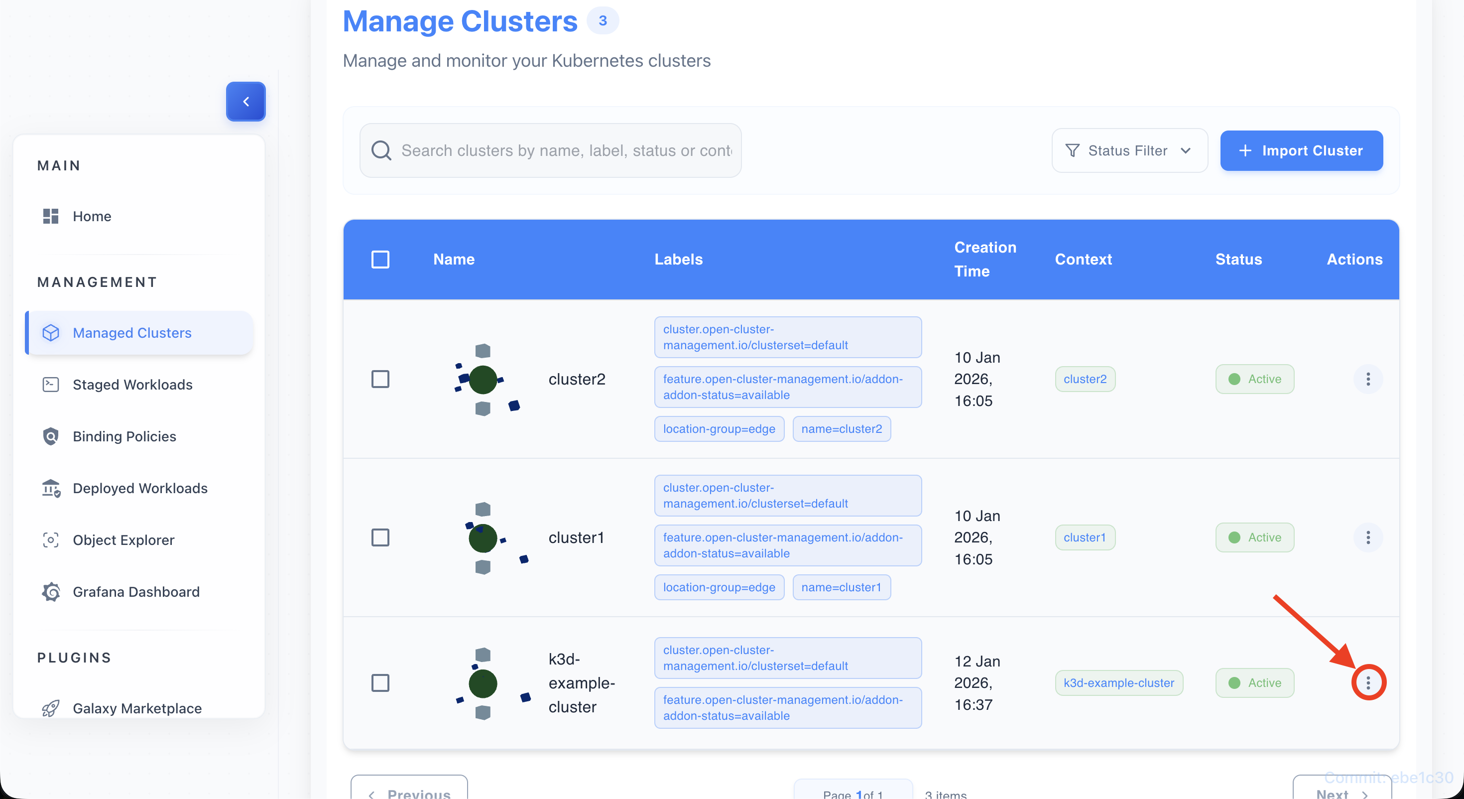 - Look for the blue “Import Cluster” button in the top-right of the clusters table.